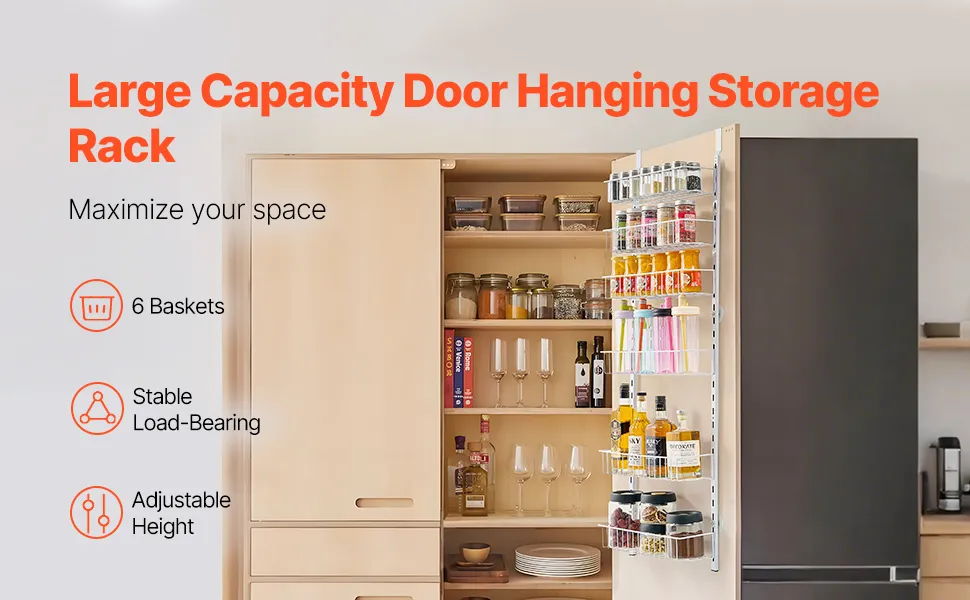 Questo Organizzatore da dispensa sopra la porta è dotato di 6 grandi cestini, massimizzando la capacità di stoccaggio. Puoi usarlo come Organizzatore da porta dispensa, porta spezie o Organizzatore per riporre gli oggetti nell'armadio, perfetto per piccoli spazi.