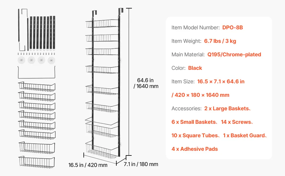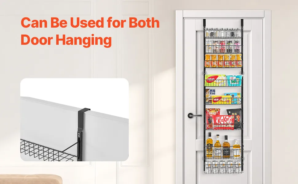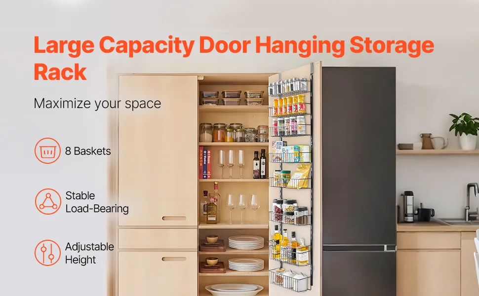Questo organizzatore da dispensa sopra la porta è dotato di 8 grandi cestini, massimizzando la capacità di stoccaggio. Puoi usarlo come organizzatore per la porta della dispensa, porta spezie o organizzatore per l'armadio, perfetto per piccoli spazi.