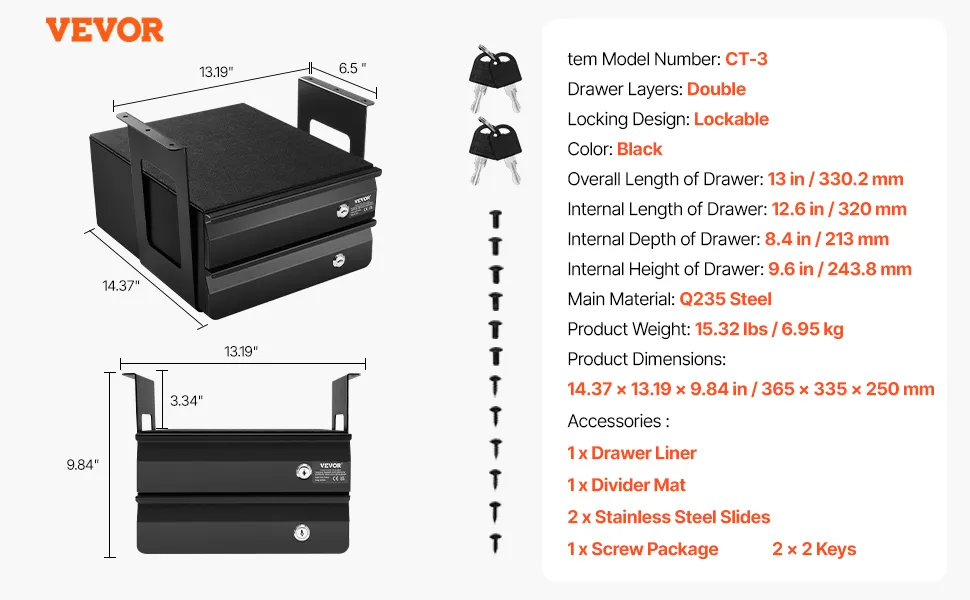 VEVOR Cassetto Estraibile Sotto Scrivania 365 x 335 x 250 mm Organizzatore Nascosto per Riporre Oggetti 2 Strati, Cassetto Portapenne Bloccabile Sottotop per Postazioni di Lavoro Seduta in Piedi, Nero