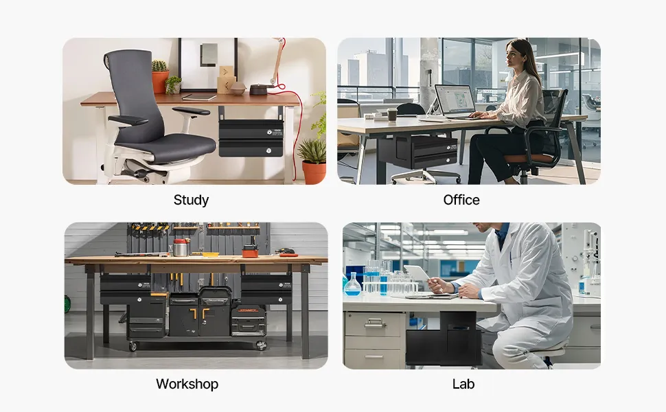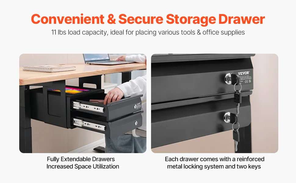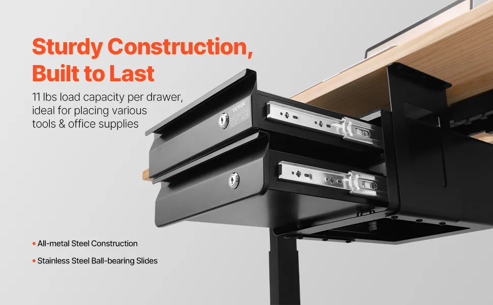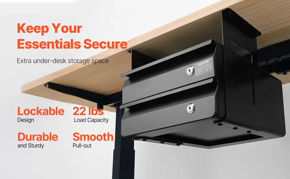 Questo cassetto sotto la scrivania è dotato di due sezioni separate bloccabili, ciascuna con una capacità di 4,98 kg. Aggiunge prezioso spazio di archiviazione sotto la scrivania.