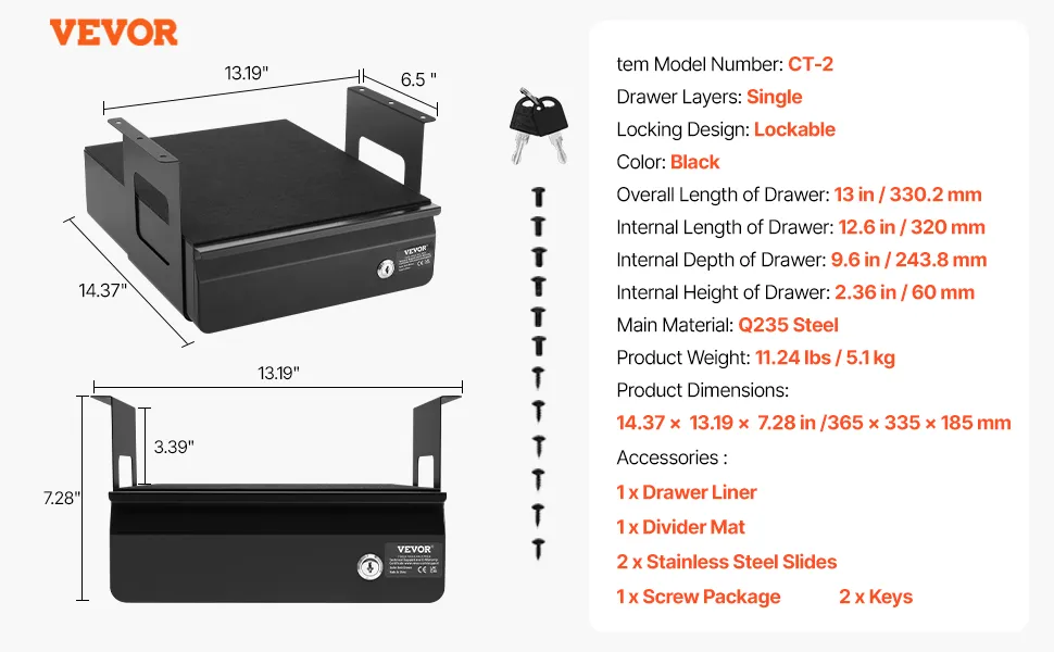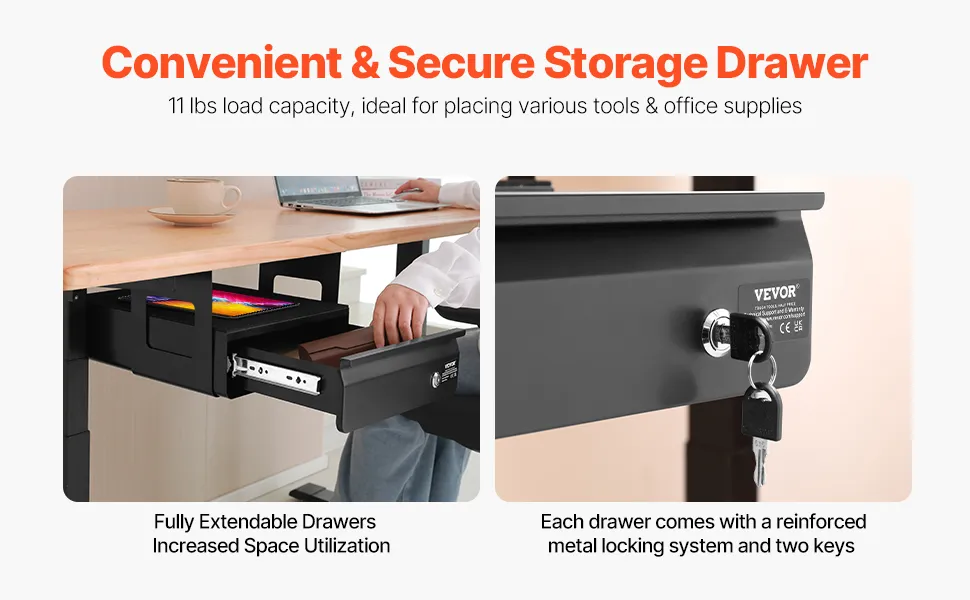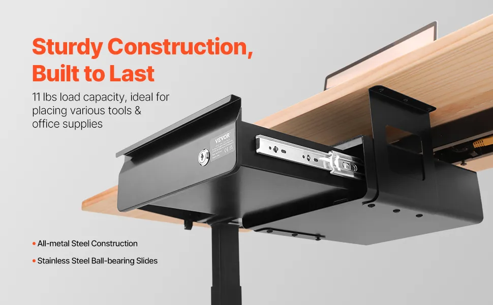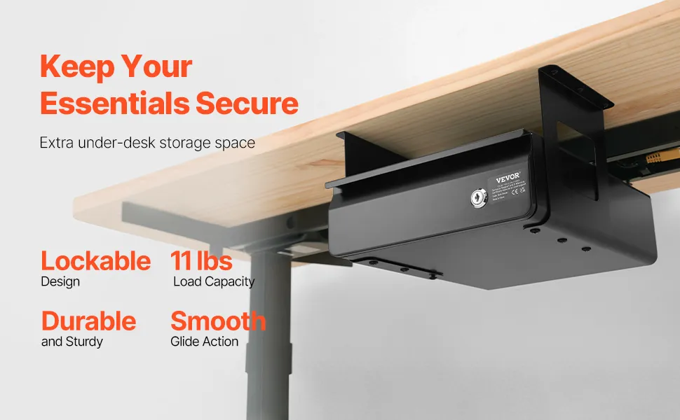 Con una capacità di carico di 4,98 kg, questo cassetto sotto la scrivania offre una soluzione di archiviazione ideale per organizzare le tue forniture per ufficio. Il design bloccabile assicura che i tuoi oggetti personali rimangano al sicuro.