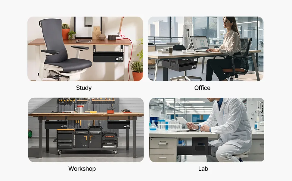 Questo organizer nascosto per la scrivania funziona con la maggior parte degli spessori di scrivania, rendendolo una soluzione di archiviazione versatile per qualsiasi ufficio domestico, garage, officina o laboratorio.