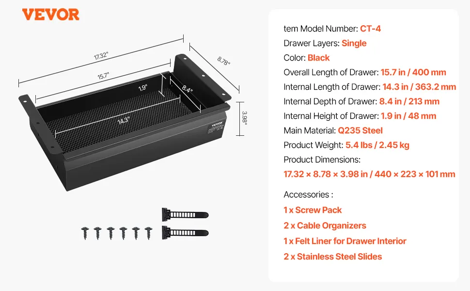 Capacità durevole: questo cassetto da scrivania da 400 mm si installa sotto la scrivania, espandendo lo spazio di archiviazione nascosto per penne, forniture per ufficio e altri piccoli oggetti per mantenere in ordine la scrivania