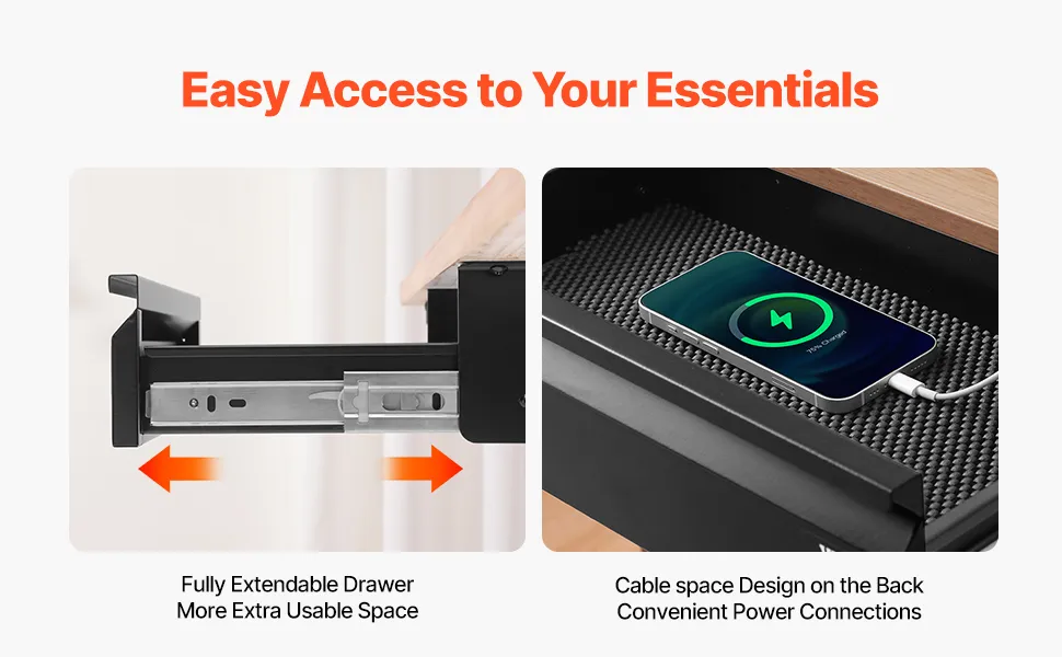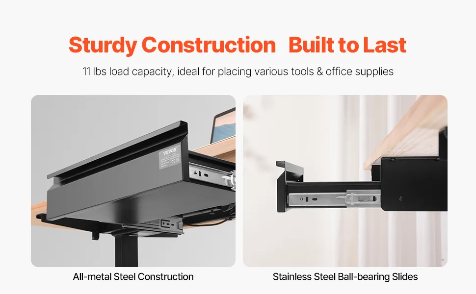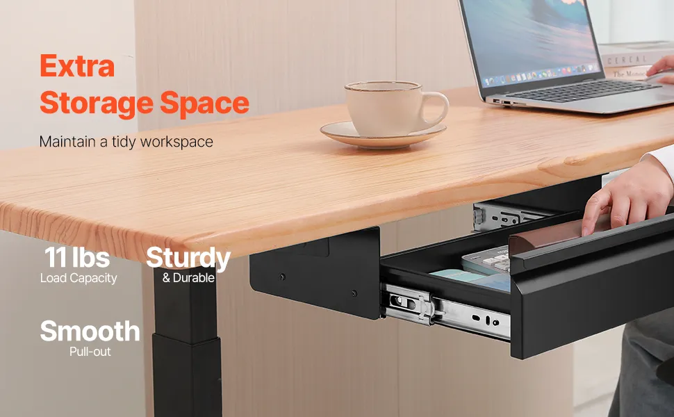 Il cassetto sotto la scrivania offre una capacità di stoccaggio aggiuntiva 4,98 kg, aiutandoti a mantenere il tuo spazio di lavoro ordinato e organizzato. Di' addio alle superfici disordinate e goditi un ambiente di lavoro più organizzato ed efficiente.