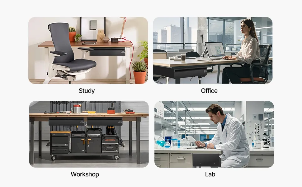 Questo organizer nascosto per la scrivania funziona con la maggior parte degli spessori di scrivania, rendendolo una soluzione di archiviazione versatile per qualsiasi ufficio domestico, garage, officina o laboratorio.