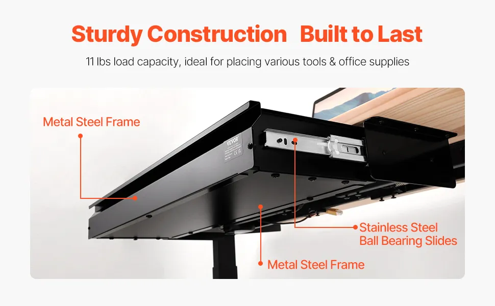 Il cassetto sottotavolo è dotato di una solida struttura in acciaio completamente metallica, montata saldamente sotto la scrivania con sei punti di fissaggio.