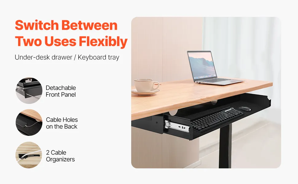 Combinazione cassetto/vassoio tastiera: questo cassetto sottotavolo da 782 mm per scrivania non solo fornisce spazio di archiviazione nascosto sotto la scrivania, ma funge anche da vassoio tastiera rimuovendo facilmente il pannello frontale
