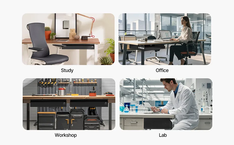 Questo organizer nascosto per la scrivania funziona con la maggior parte degli spessori di scrivania, rendendolo una soluzione di archiviazione versatile per qualsiasi ufficio domestico, garage, officina o laboratorio.