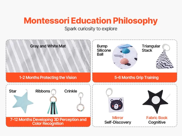 6 giocattoli sensoriali e 2 palline tattili: questo tappetino da gioco a pancia in giù è dotato di 6 giocattoli pendenti rimovibili che favoriscono lo sviluppo sensoriale generale del bambino e la coordinazione occhio-mano. 2 palline di silicone irregolari e la pila triangolare, il nastro, la stella, il sonaglio, lo specchio per l'auto-scoperta