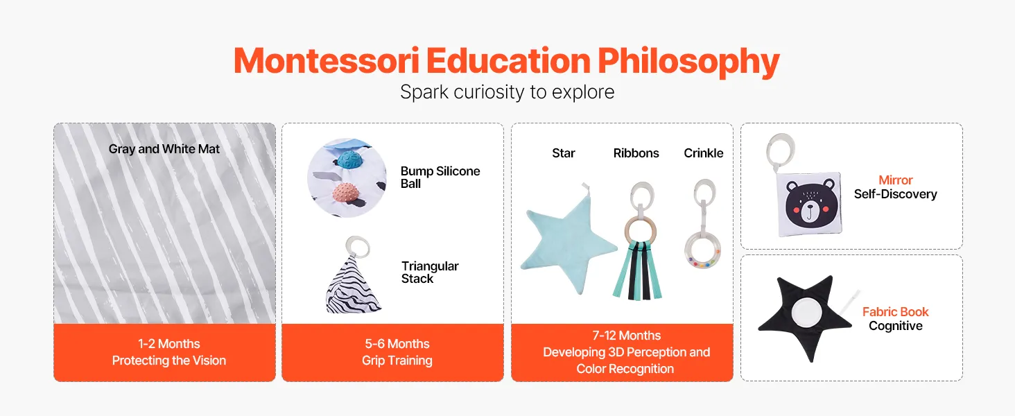 Stimola la curiosità del tuo bambino con i nostri 6 giocattoli interattivi e palline tattili. 2 palline in silicone con rilievi e la pila triangolare, il nastro, la stella, il sonaglio, lo specchio per l'auto-scoperta e il libro di stoffa stimolano lo sviluppo tattile, uditivo.