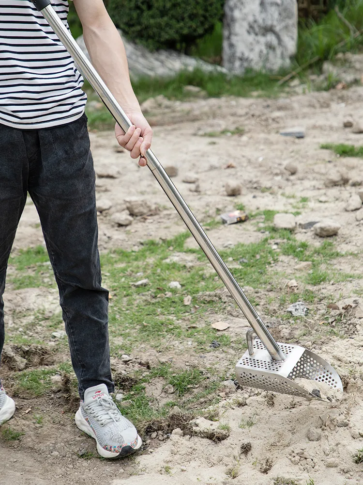 Realizzato in acciaio inossidabile di alta qualità da 2 mm di spessore, è abbastanza robusto e resistente per una lunga durata. I fori rotondi da 10 mm sono progettati per una rapida vagliatura e una rapida ricerca. Il design ergonomico della maniglia offre una presa comoda e facile. Essendo sia robusto che leggero, è facile da trasportare. Inoltre, può funzionare con un metal detector per la caccia al tesoro.