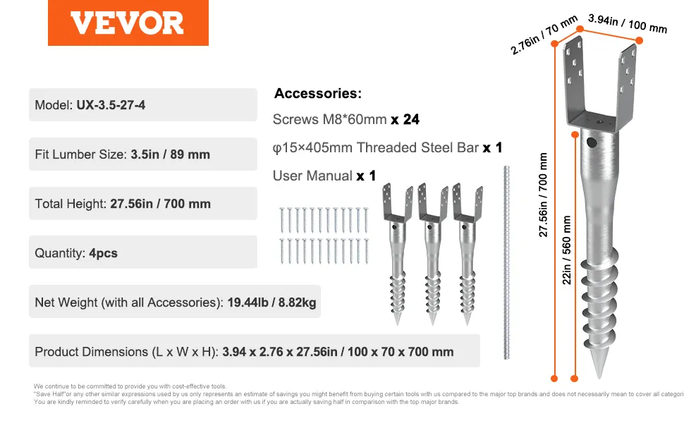 L'ancoraggio a terra senza scavo VEVOR è realizzato per adattarsi al legname da 3,5 pollici. Ciò lo rende una soluzione versatile per varie esigenze di supporto. Il picchetto semi-chiuso ha un'altezza totale di 27,99 pollici e una lunghezza di 27,56 pollici. Ha anche una lunghezza del chiodo di 22 pollici, che fornisce un supporto eccellente per il tuo legname. Questa caratteristica assicura che il legname rimanga stabile e sicuro. Questo picchetto a terra per pali di recinzione è adatto sia per applicazioni residenziali che commerciali. Che tu stia lavorando su un palo della posta o su una grande recinzione, questo ancoraggio può gestirlo. Il design consente una facile installazione e sostituzione del legname. Quindi, è una scelta incredibilmente comoda per la manutenzione continua.