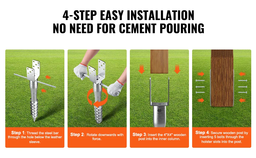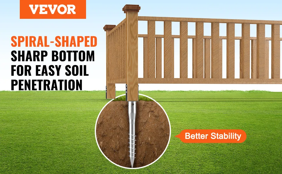 L'ancoraggio a terra senza scavo VEVOR include viti per legno e barre filettate. Questi componenti aiutano a stringere la connessione tra il legno e il picchetto. Questo robusto supporto per palo in acciaio assicura una tenuta salda e una maggiore sicurezza. Le viti extra garantiscono tranquillità. Garantiscono che l'installazione rimarrà stabile e sicura. Inoltre, ti assicurano che puoi sostituirla dopo un uso prolungato. Consente il riciclaggio senza la necessità di strappare via l'intero set. Ulteriori caratteristiche di sicurezza rendono questo ancoraggio una scelta affidabile. Dovresti scegliere questo ancoraggio se hai bisogno di una soluzione duratura per progetti all'aperto.