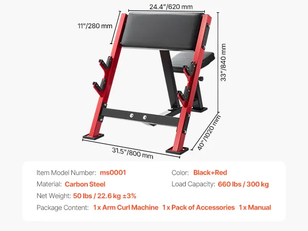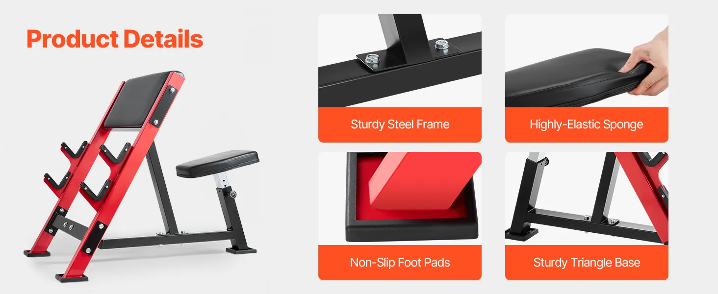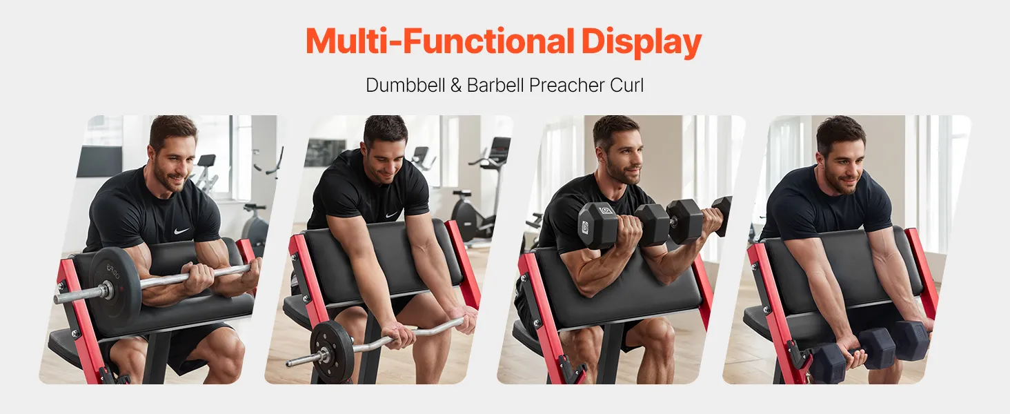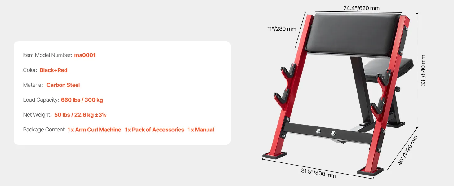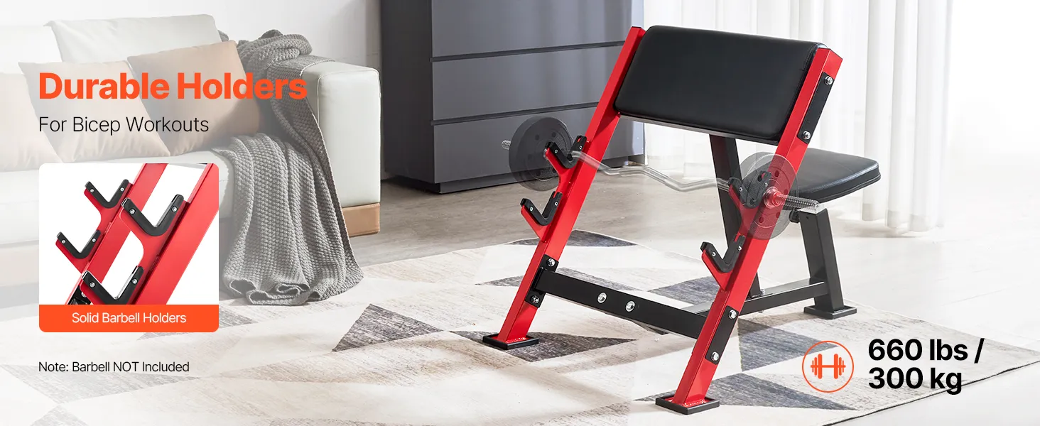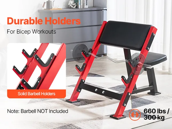 Supporto per bilanciere resistente: progettato con solidi supporti per bilanciere e una robusta capacità di peso di 660 libbre (300 kg), questa panca per curl predicatore è costruita per il sollevamento di carichi pesanti. Nota: il bilanciere non è incluso