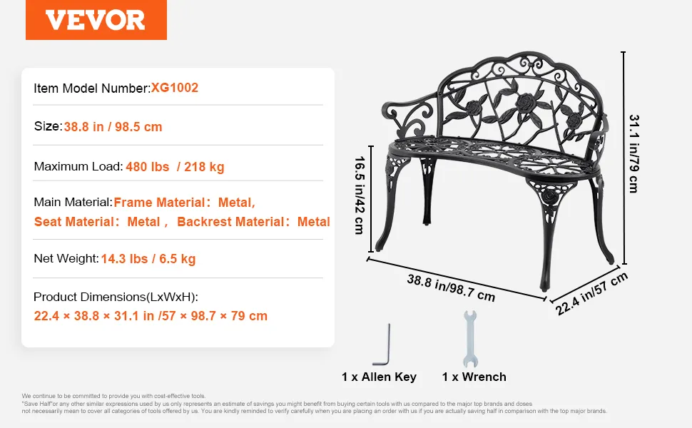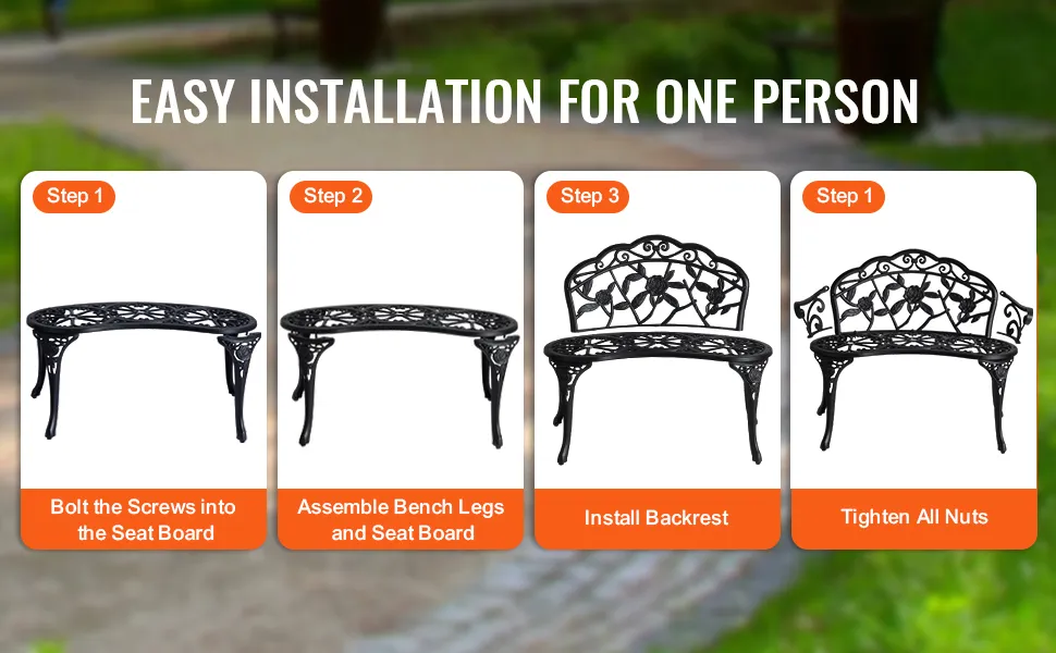 La nostra panchina da giardino VEVOR è semplice da montare. Puoi averla montata e pronta all'uso in soli 15 minuti, così potrai goderti il tuo spazio all'aperto prima possibile. Il semplice processo di montaggio ti assicura di concentrarti su ciò che conta di più: goderti i meravigliosi spazi aperti.
