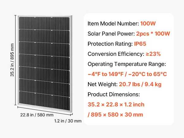 Il pannello solare monocristallino VEVOR da 2 pezzi da 100 W offre un'efficienza di conversione ≥23%, connettività MC4 stabile, protezione IP65 e telaio in alluminio anticorrosione. Funziona in modo affidabile in diversi ambienti e fornisce energia costante per auto.