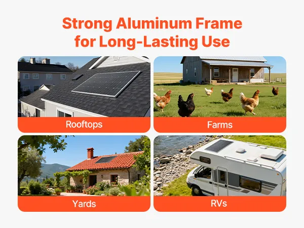 Ampie applicazioni: ideale per installazioni piatte su tetti, fattorie, cortili, camper, barche o veicoli con tetto piatto e cabine fuori rete, questo pannello solare con cornice fornisce energia costante e affidabile per elettrodomestici