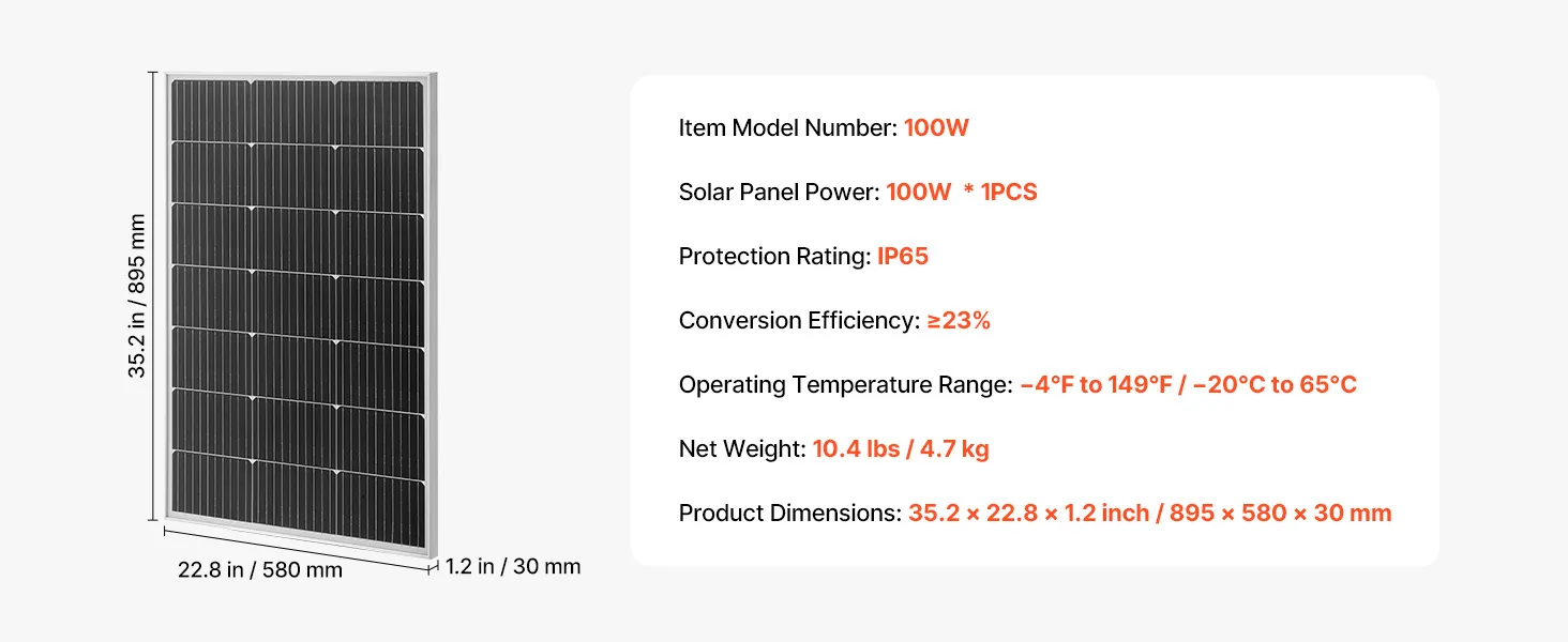 Questo pannello solare monocristallino VEVOR da 100 W offre un'efficienza di conversione ≥23%, connettività MC4 stabile, protezione IP65 e telaio in alluminio anticorrosione. Funziona in modo affidabile in diversi ambienti e fornisce energia costante per auto, camper, barche.
