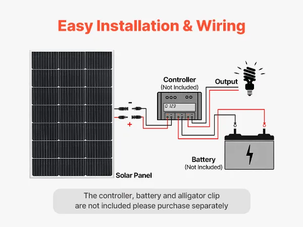 Dotato di un cavo MC4 integrato, questo pannello solare fotovoltaico monocristallino offre una connessione sicura al controller e alla batteria per un'erogazione di energia stabile. (Controller, batteria e morsetti a coccodrillo non sono inclusi).