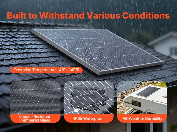 Dotato di un grado di protezione IP65 e di una robusta superficie in vetro temperato, questo pannello solare funziona in modo affidabile da -20°C a 65°C (da -4°F a 149°F), garantendo prestazioni stabili e durature in vari ambienti esterni.