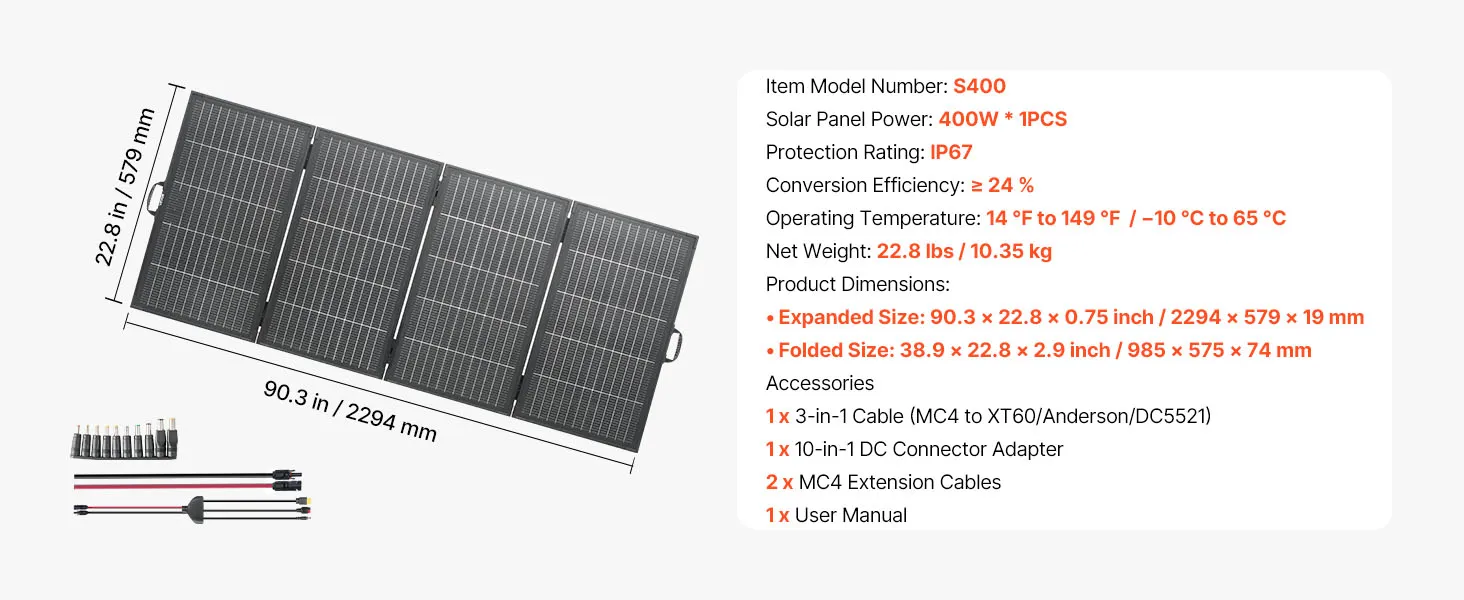 VEVOR Pannello Solare Pieghevole 400 W con Telaio, Pannello Solare Monocristallino di Tipo N da 16 BB, Caricabatterie IP67 con Uscita MC4 e Adattatore CC per Centrali Elettriche, Campeggio