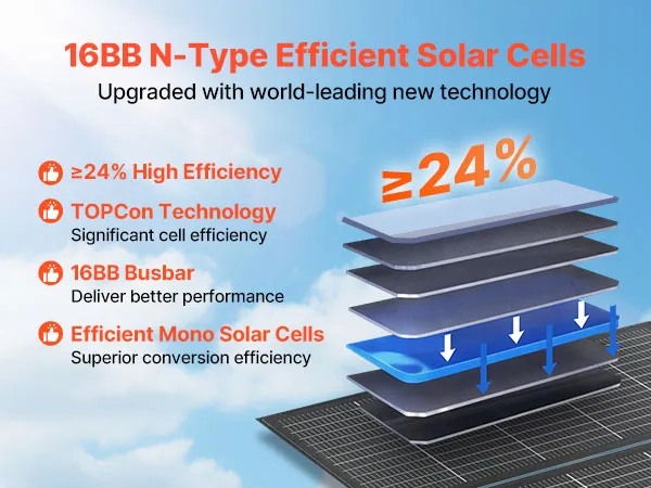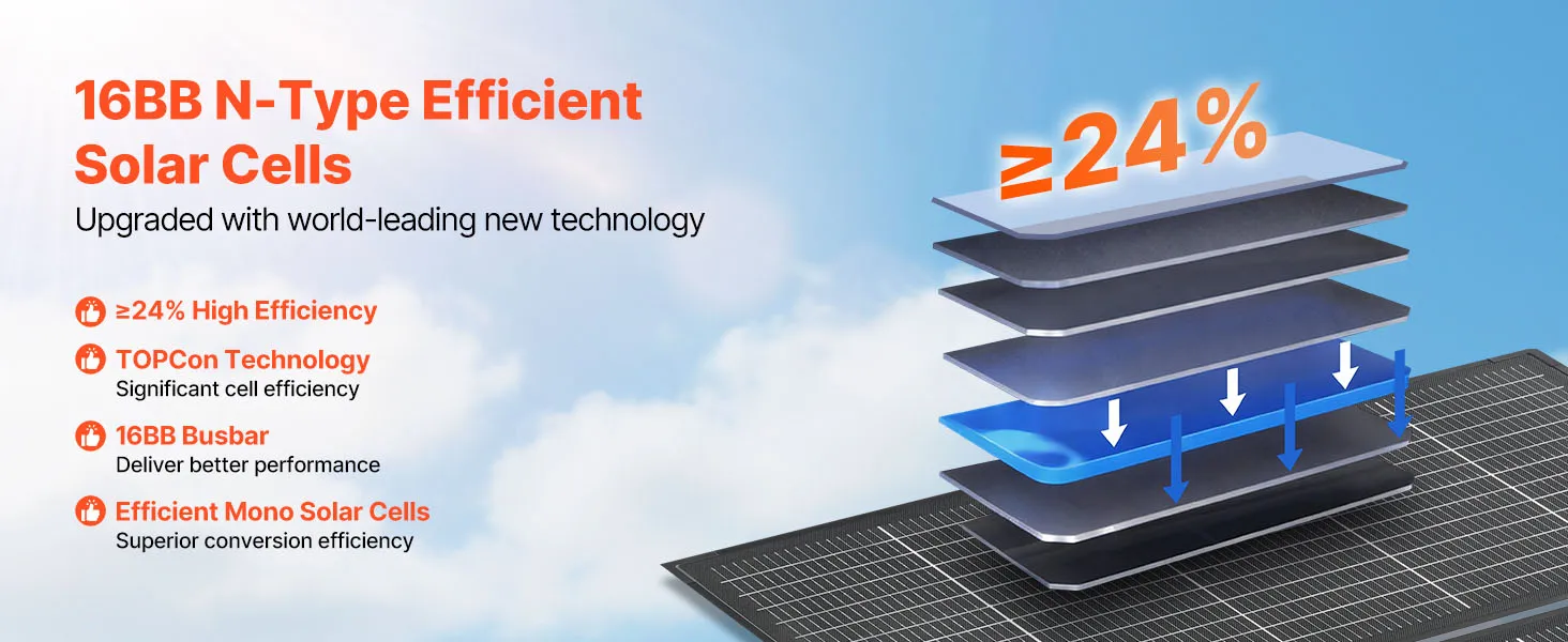 Dotato di celle solari monocristalline ad alta efficienza di tipo N da 16 BB, questo pannello solare cattura più luce solare e garantisce un'erogazione di energia costante e costante per alimentare i tuoi dispositivi.