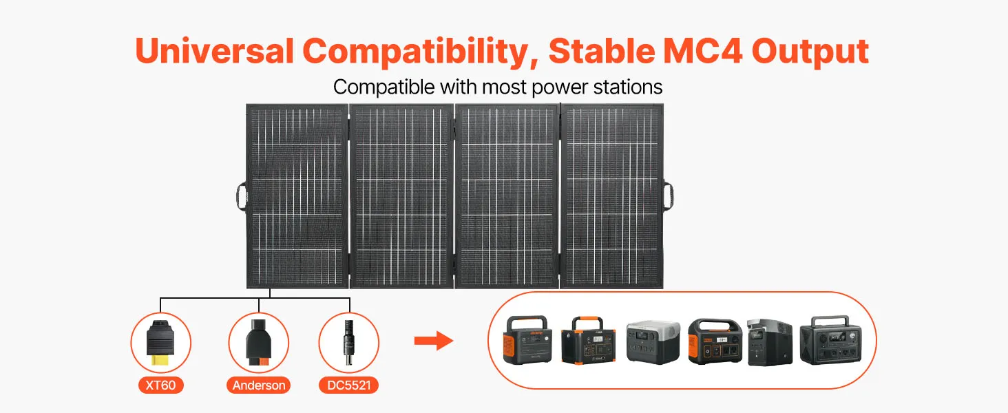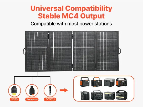 Il nostro pannello solare monocristallino è dotato di un'uscita MC4 stabile, un cavo connettore MC4 3 in 1 (da MC4 a XT60 / Anderson / DC5521) e un adattatore connettore CC 10 in 1, ampiamente compatibile con la maggior parte delle centrali elettriche.