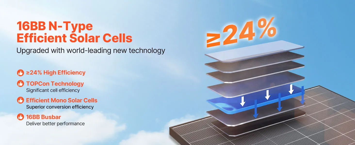 Dotato di celle solari monocristalline ad alta efficienza di tipo N da 16 BB, questo pannello solare cattura più luce solare e garantisce un'erogazione di energia costante e costante per alimentare i tuoi dispositivi.