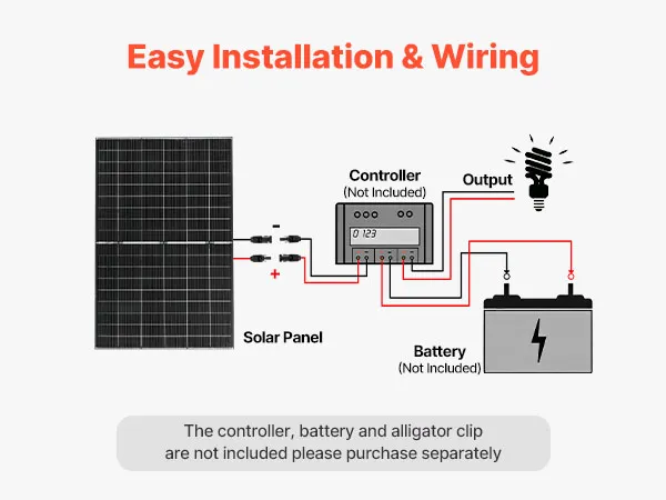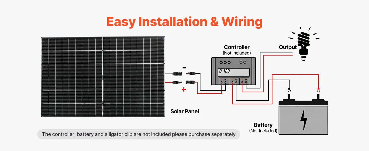Dotato di un cavo MC4 integrato, questo pannello solare fotovoltaico monocristallino garantisce una facile connessione al controller e alla batteria per un'erogazione di energia stabile. (Controller, batteria e morsetti a coccodrillo NON sono inclusi.)