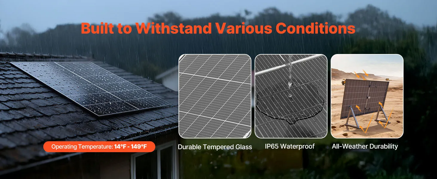 Questo pannello solare è dotato di una struttura resistente, che lo rende ideale per installazioni a lungo termine su tetti piani, tetti di case, fattorie, cortili o camper, garantendo un'alimentazione elettrica costante e affidabile. (Le staffe di montaggio NON sono incluse)