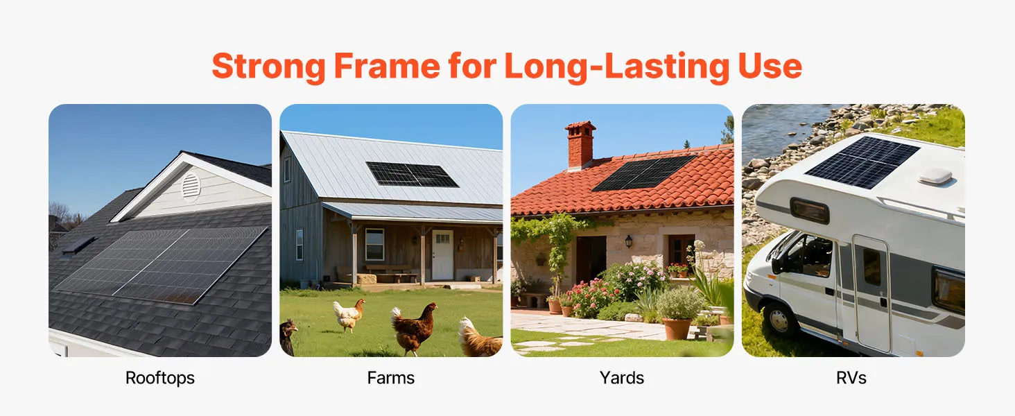 Ampie applicazioni: ideale per installazioni piatte su tetti, fattorie, cortili, camper, barche o veicoli con tetto piatto e cabine fuori rete, questo pannello solare con cornice fornisce energia costante e affidabile per elettrodomestici, illuminazione da cortile, apricancelli, attrezzature per camper, ecc