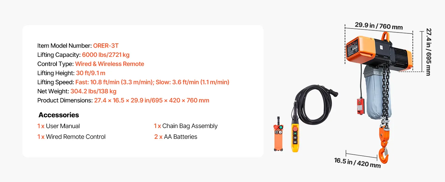 VEVOR Paranco Elettrico a Catena Fisso da 2721 kg, Paranco a Catena Doppia G100, Altezza di Sollevamento 9,1 m, con Telecomando Wireless da 100 m e Telecomando Cablato da 8,2 m, Trifase per Fabbriche
