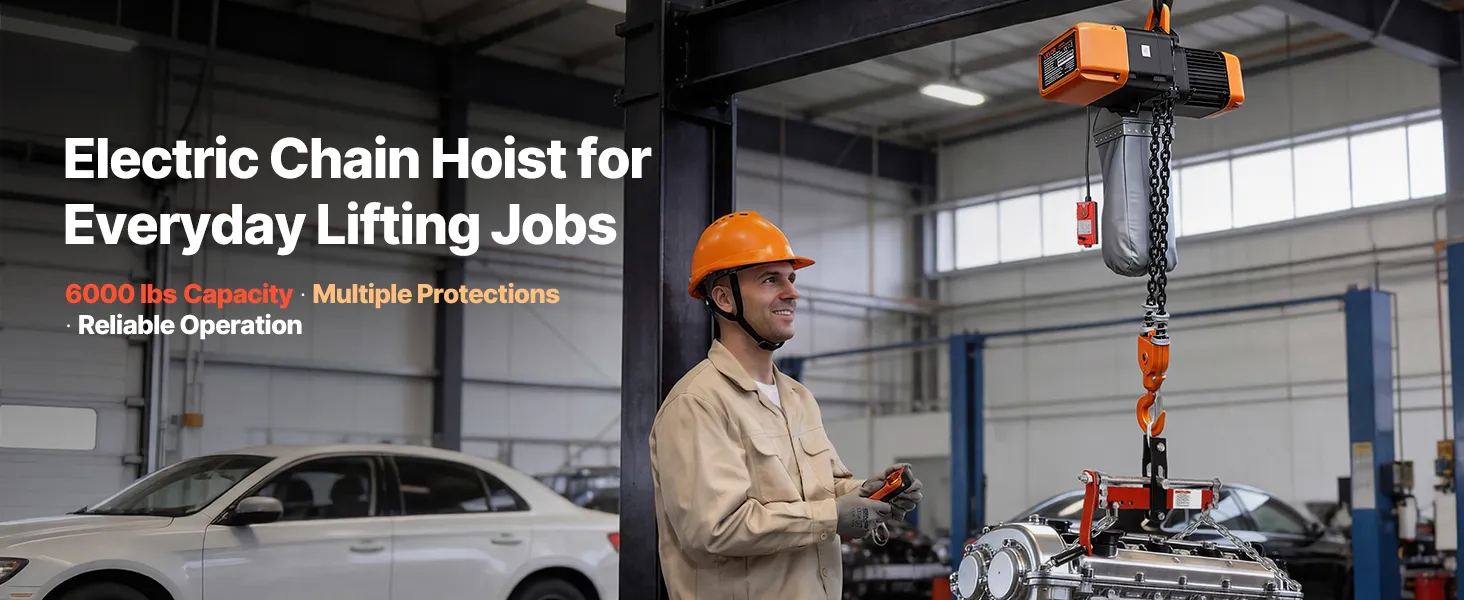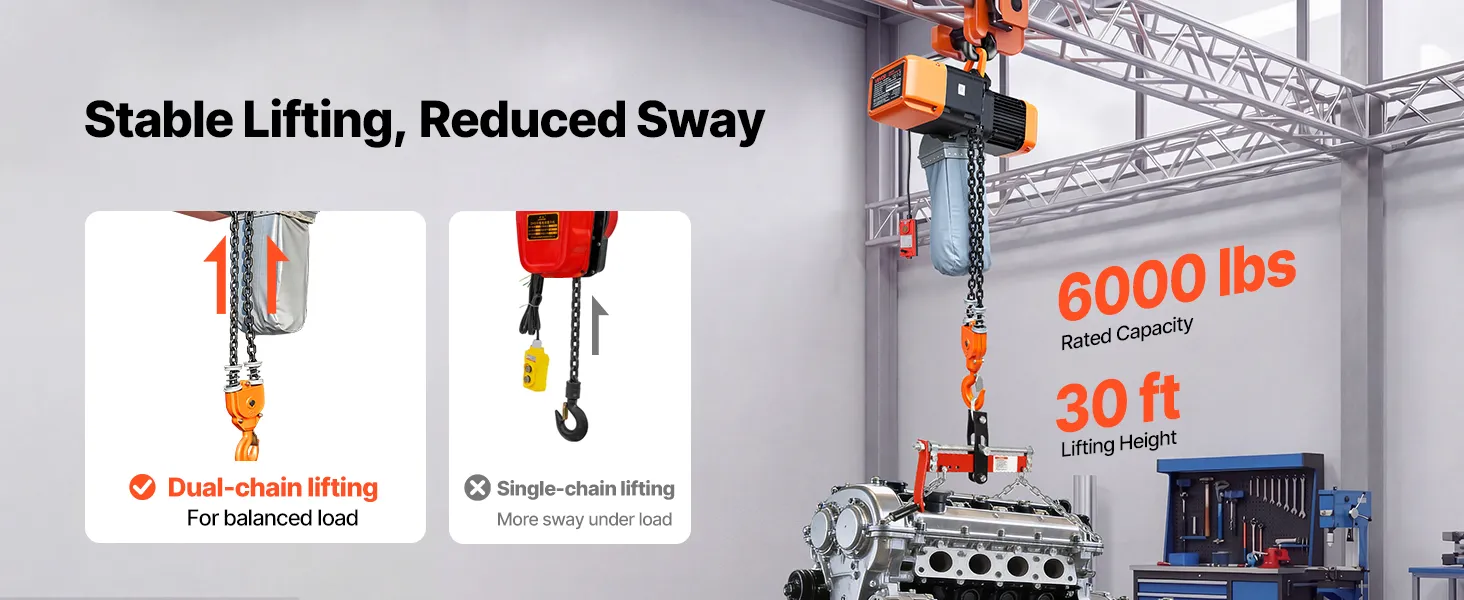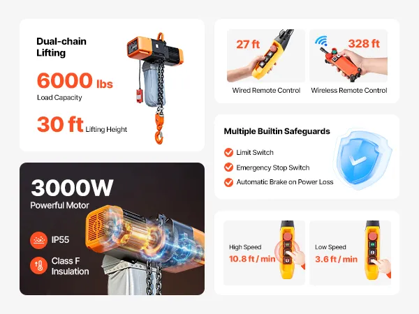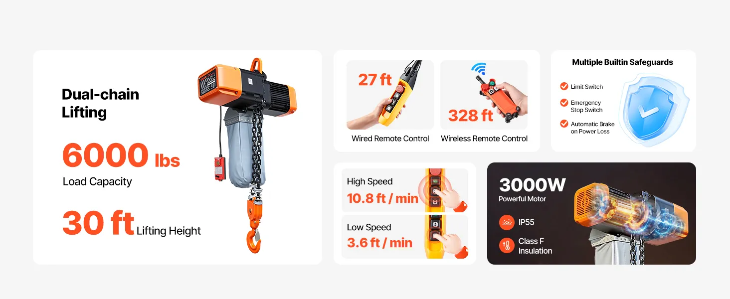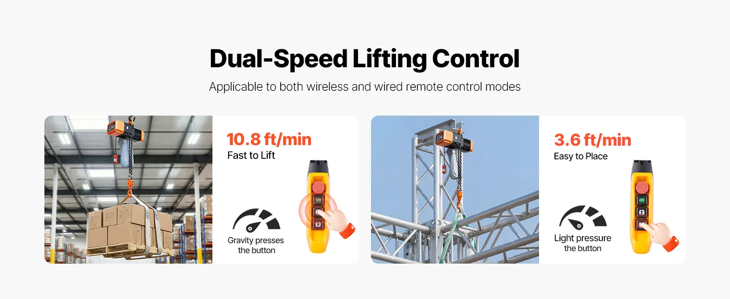 Il paranco elettrico a catena solleva fino a 2721 kg con doppia catena e altezza di 9 m, ideale per manutenzione e riparazioni quotidiane. La doppia velocità con controllo cablato e wireless garantisce posizionamento rapido e preciso. Le catene G100 assicurano un uso affidabile.