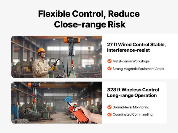 Libertà cablata e wireless: questo paranco elettrico a catena offre un telecomando cablato per lavori ravvicinati e un telecomando wireless fino a 100 m. Le opzioni di controllo flessibili ti aiutano a rimanere comodo e sicuro durante ogni sollevamento