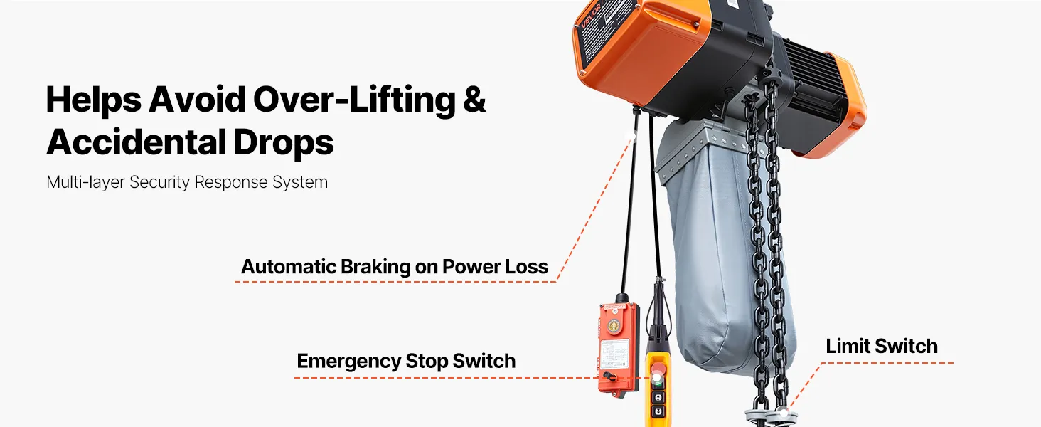 Protezioni di sicurezza multiple: Questo paranco elettrico a catena include finecorsa superiore e inferiore, frenata automatica in caso di interruzione di corrente e arresto di emergenza. Le protezioni integrate contribuiscono a rendere ogni sollevamento più sicuro e controllato