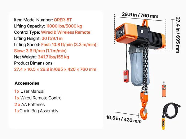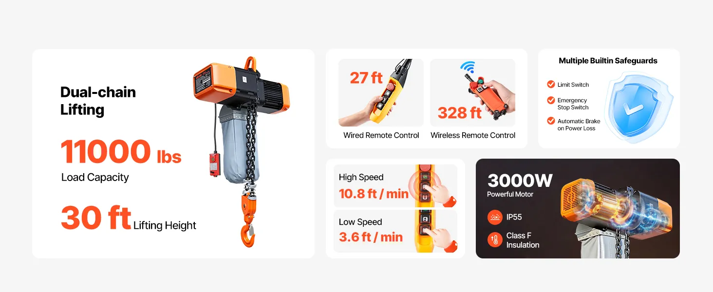 VEVOR Paranco Elettrico a Catena Fisso da 5000 kg, Paranco a Catena Doppia G100, Altezza di Sollevamento 9,1 m, con Telecomando Wireless da 100 m e Telecomando Cablato da 8,2 m, Trifase per Fabbriche