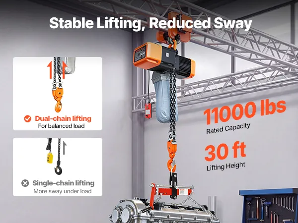 Prestazioni di sollevamento elevate: Questo paranco elettrico a catena solleva fino a 5000 kg con un sistema a doppia catena che bilancia il carico in modo uniforme. L'altezza di sollevamento di 9,1 metri consente di gestire motori, componenti e acciaio con facilità, grazie all'alimentazione trifase da 380-415 V, 50 Hz