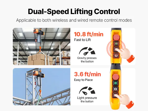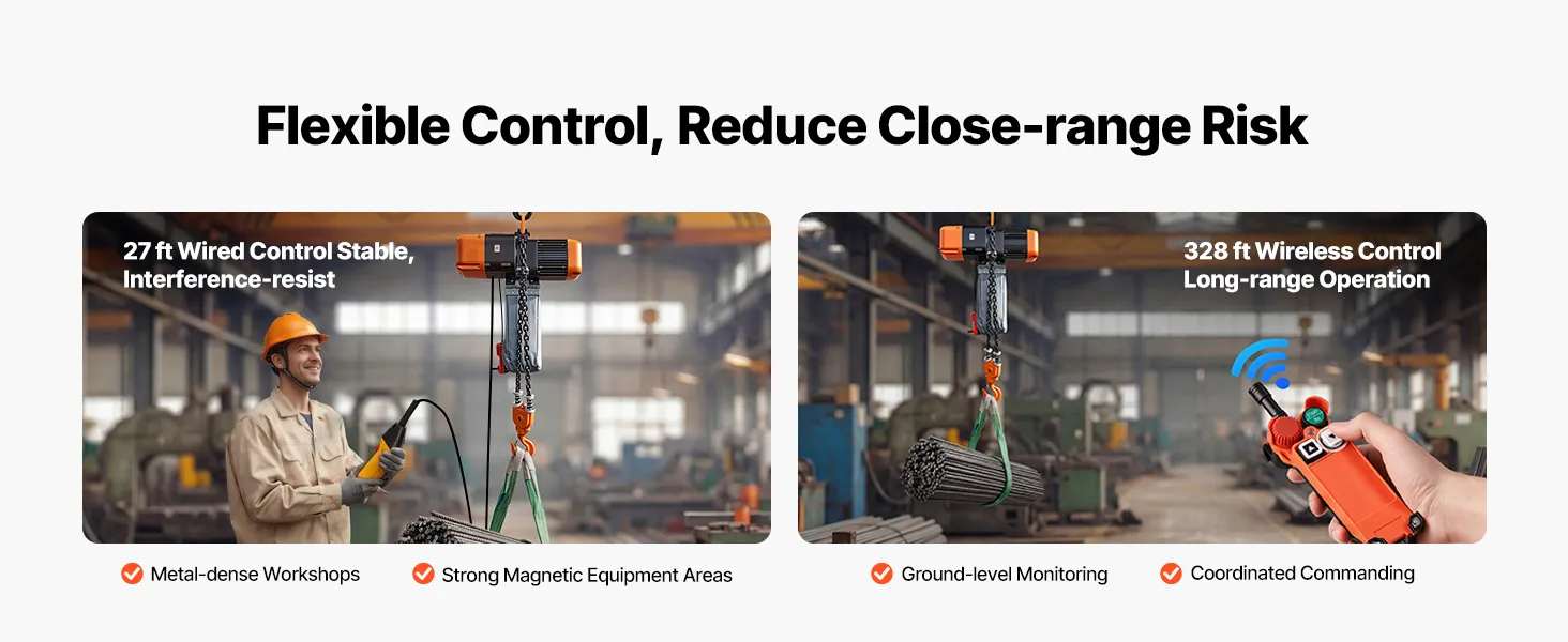 Libertà cablata e wireless: Questo paranco elettrico a catena offre un telecomando cablato per lavori ravvicinati e un telecomando wireless fino a 100 m. Le opzioni di controllo flessibili ti aiutano a rimanere comodo e sicuro durante ogni sollevamento