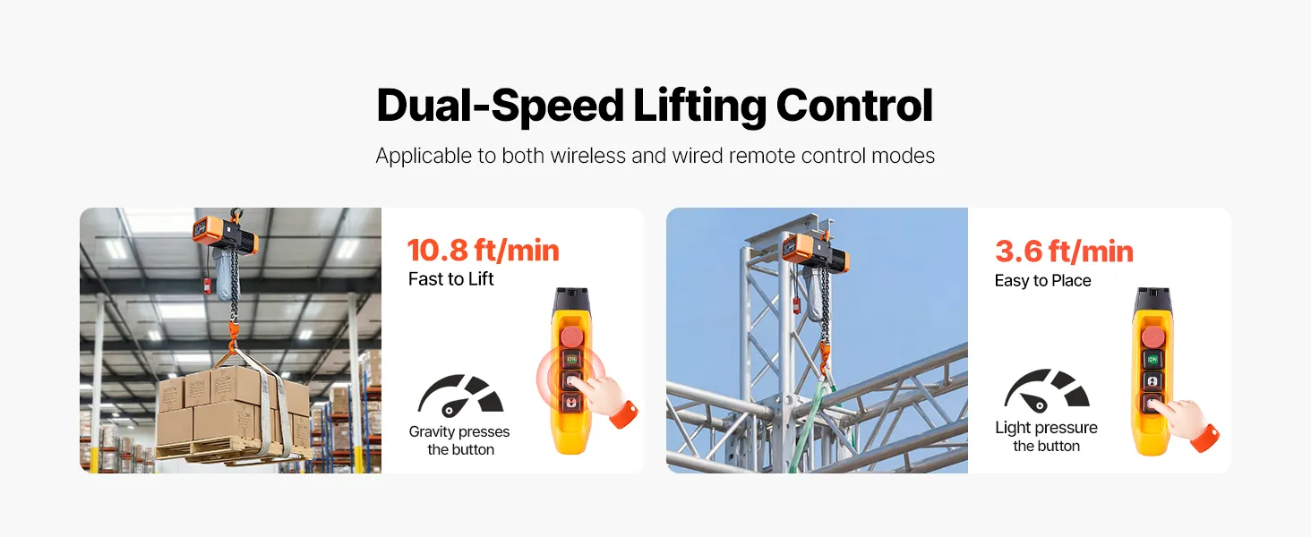 Divertimento con controllo a doppia velocità: Questo paranco per gru a ponte funziona velocemente a 3,2 m/min per sollevamenti rapidi e lentamente a 1,1 m/min per un posizionamento preciso. Il design a due velocità consente di passare agevolmente dalla potenza alla precisione