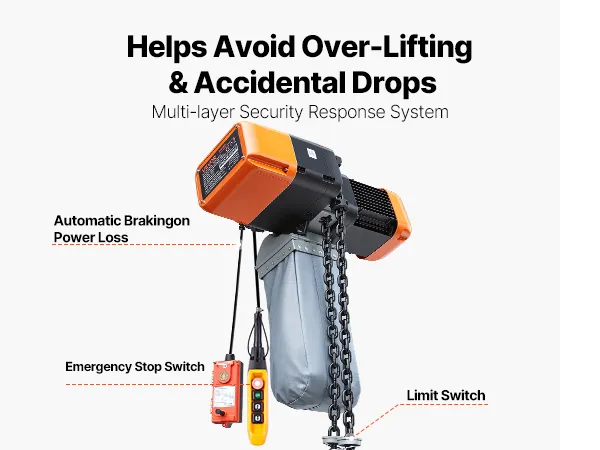 Protezioni di sicurezza multiple: Questo paranco elettrico a catena include finecorsa superiore e inferiore, frenata automatica in caso di interruzione di corrente e arresto di emergenza. Le protezioni integrate contribuiscono a rendere ogni sollevamento più sicuro e controllato