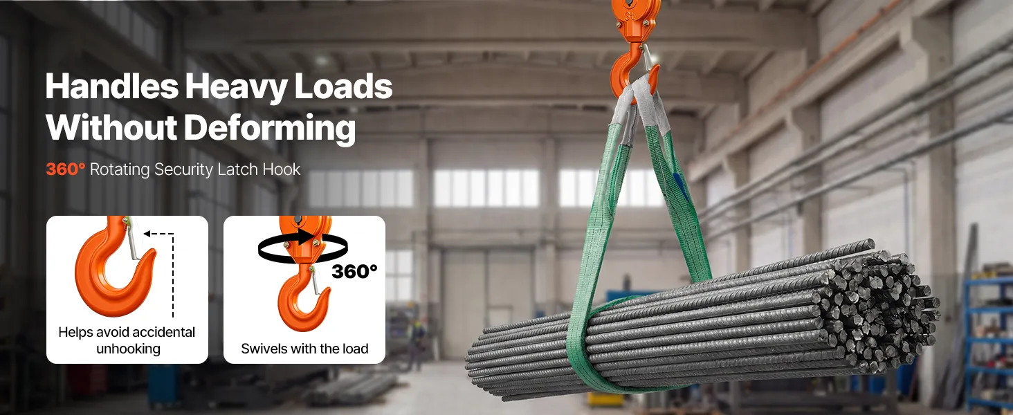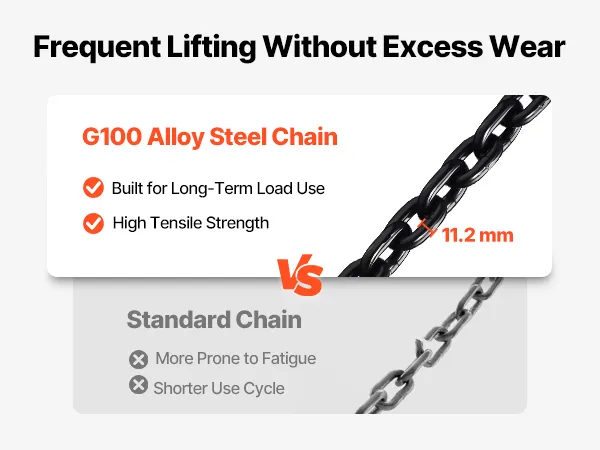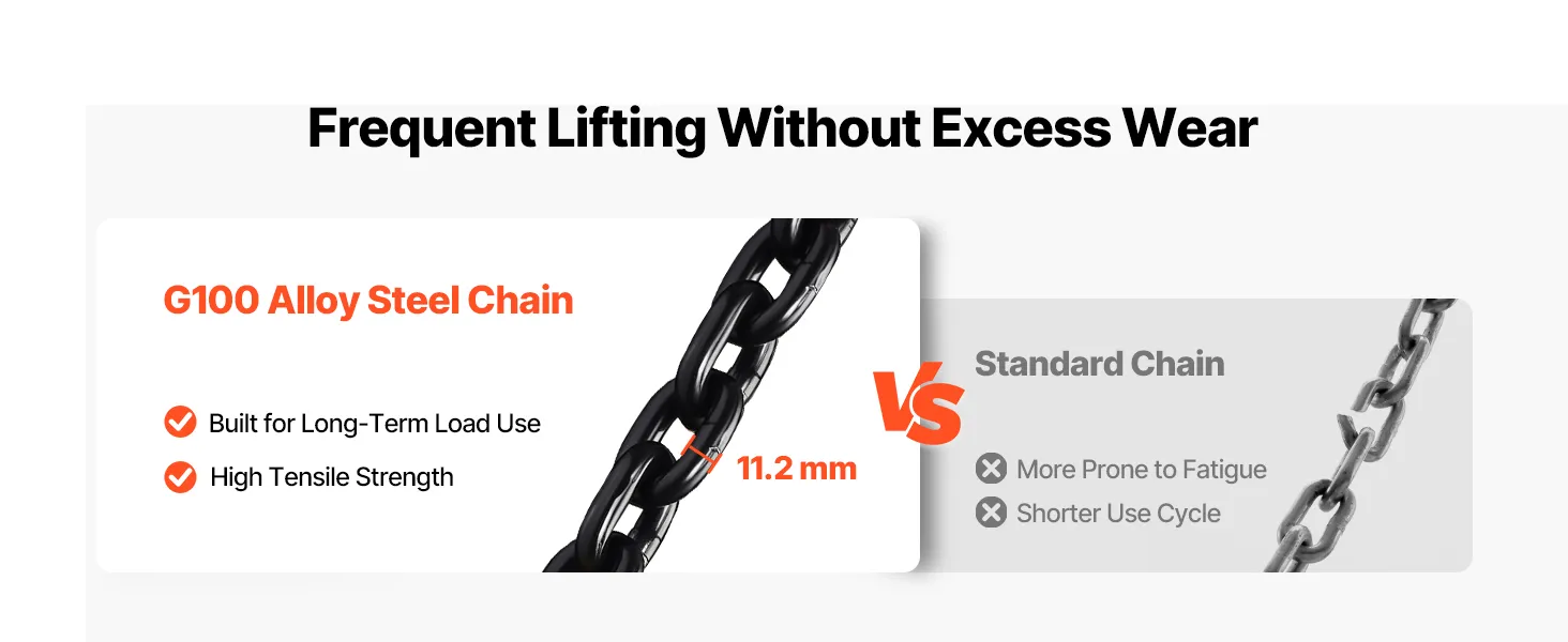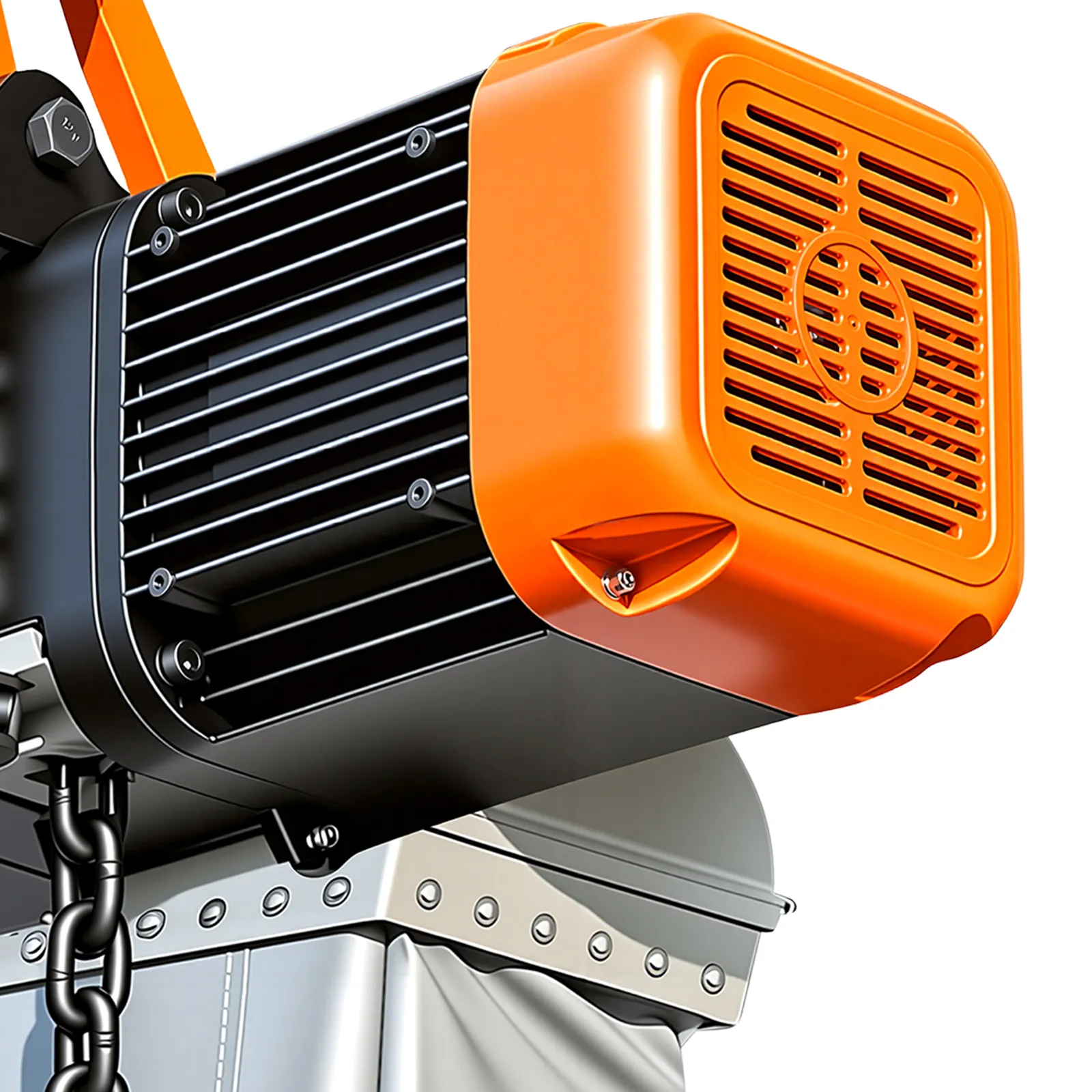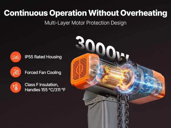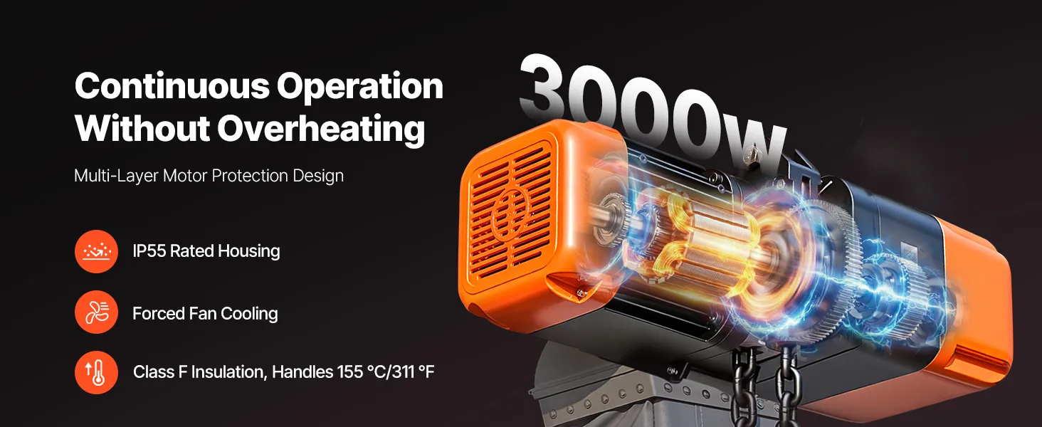 Struttura robusta, costruita per durare: Questo paranco elettrico ad alta potenza è dotato di catene in lega di acciaio G100, un gancio forgiato girevole a 360° e un alloggiamento in alluminio. Il motore IP55, la ventola di raffreddamento e l'isolamento di classe F garantiscono un utilizzo quotidiano affidabile