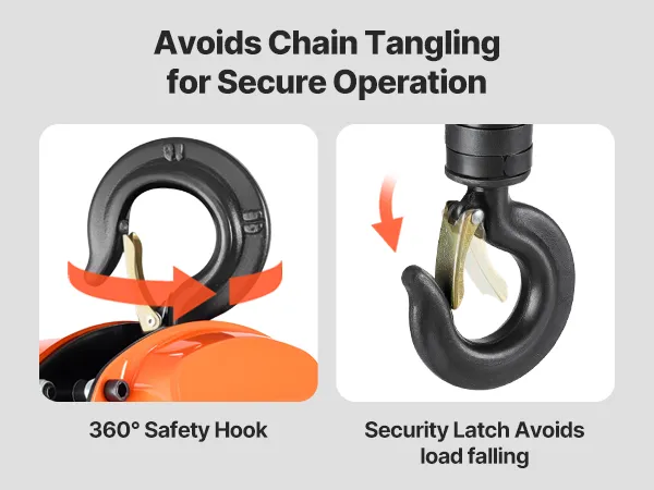 Ganci girevoli a 360°: entrambi i ganci ruotano di 360° per un posizionamento facile e flessibile. Il blocco di sicurezza della caduta manuale della catena garantisce un utilizzo sicuro e l'angolo di sollevamento regolabile mantiene la catena