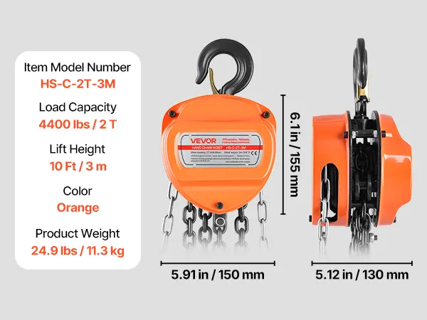 Capacità di sollevamento di 4400 libbre (2 tonnellate): questo paranco a catena manuale gestisce facilmente carichi pesanti, supportando fino a 4400 libbre (2 tonnellate) e raggiungendo altezze fino a 10 piedi (3 m)