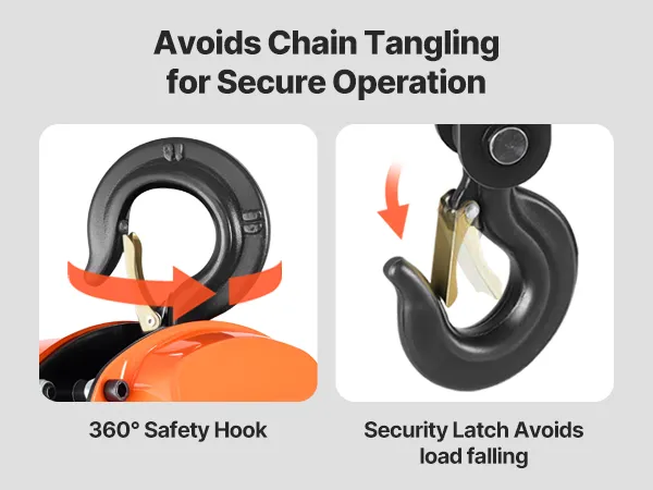 Ganci girevoli a 360°: entrambi i ganci ruotano di 360° per un posizionamento facile e flessibile. Il blocco di sicurezza della caduta manuale della catena garantisce un utilizzo sicuro e l'angolo di sollevamento mantiene la catena senza grovigli