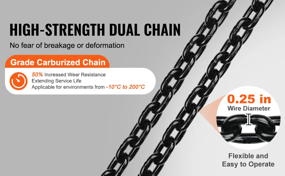 Venite a conoscere la catena carbonizzata, dura come l'acciaio, in qualità DT per paranchi elettrici. Con un allungamento a rottura superiore al 5%, è progettato per durare e non ti deluderà.