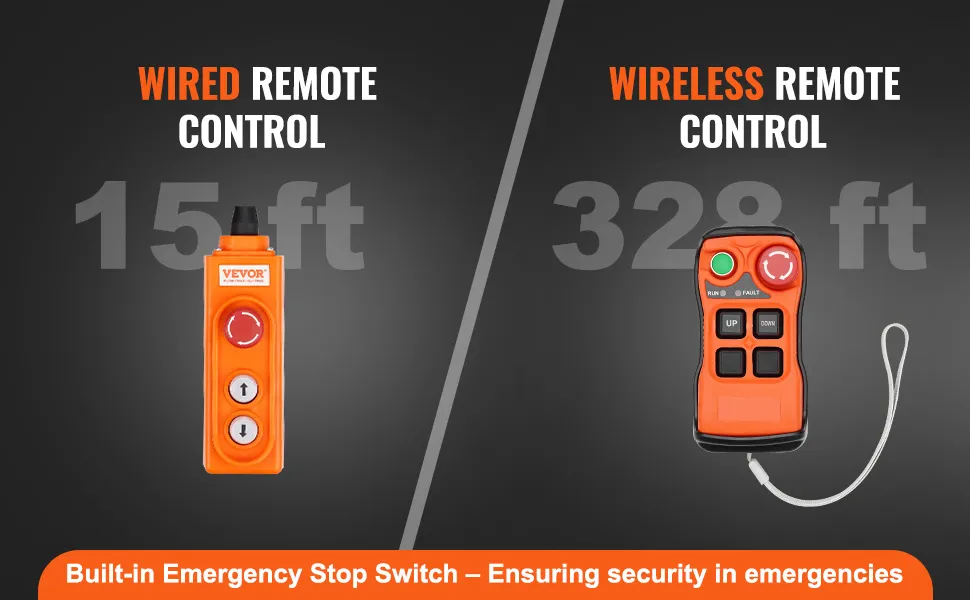 Doppio controllo wireless e cablato: il nostro paranco elettrico a catena ti consente di scegliere tra un cavo di sicurezza da 4,5 m/15 piedi per il controllo cablato e una portata wireless di 100 m/328 piedi per la massima libertà.