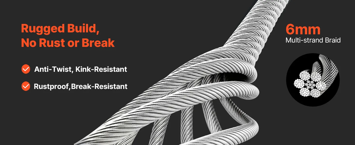 Robusta struttura del cavo: questa gru portatile con verricello elettrico è dotata di un cavo in acciaio zincato ad alta resistenza, resistente alla torsione e alla corrosione
