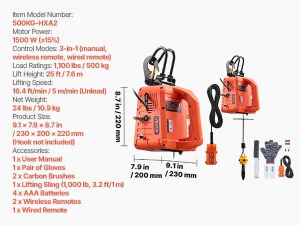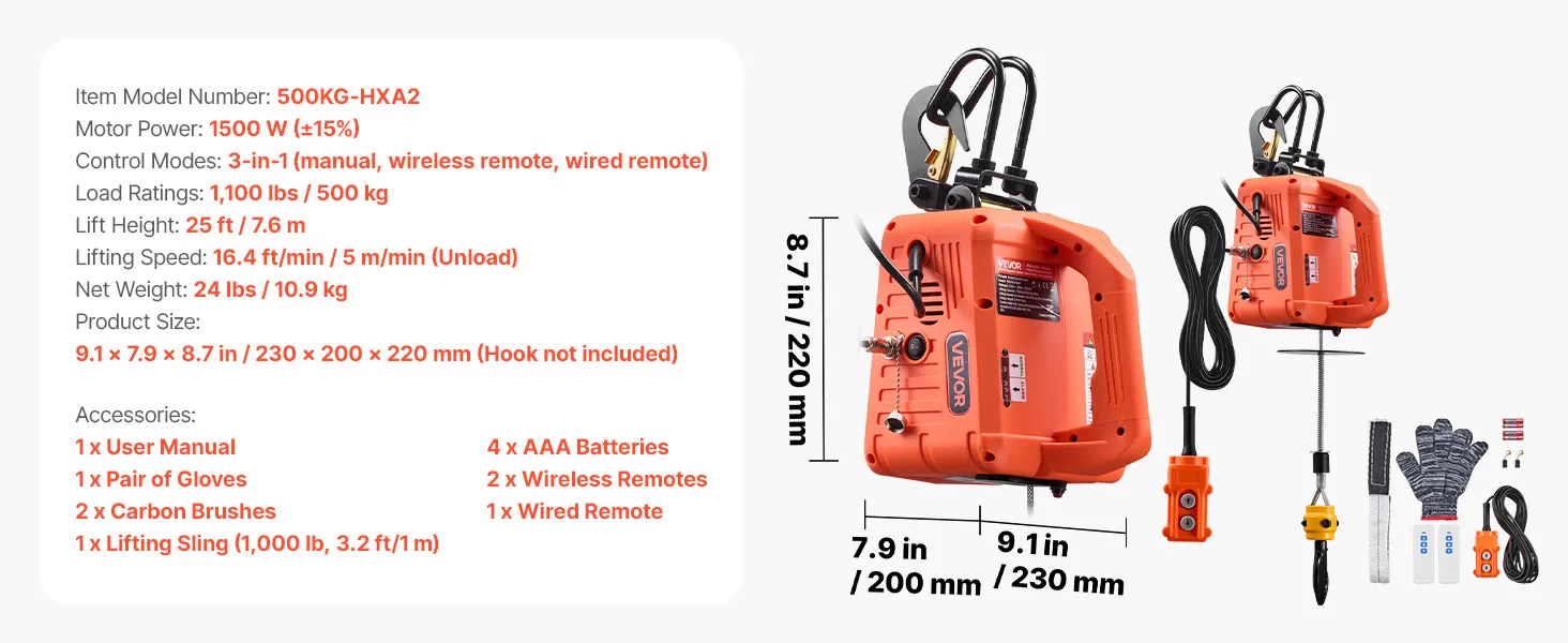 VEVOR Verricello Paranco Elettrico di Sollevamento Capacità Carico 500 kg, Verricello Argano Elettrico Portatile da 1500 W, Altezza di Sollevamento 7,6 m, con Telecomando Manuale, Cablato Wireless