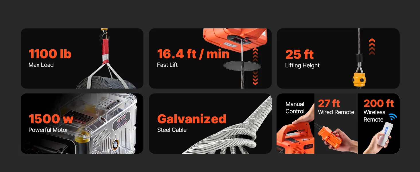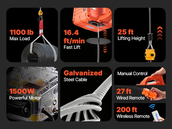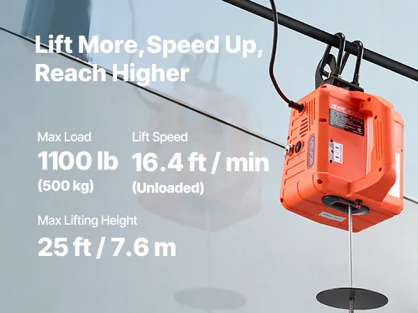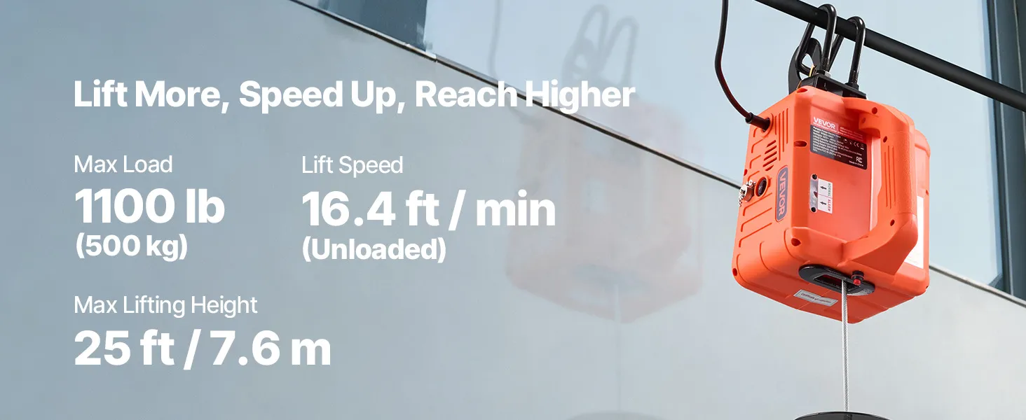 Potente capacità di sollevamento: questo argano elettrico portatile gestisce fino a 1.100 libbre, solleva a 16,4 piedi/min (senza carico) e raggiunge i 25 piedi. Ti aiuta a sollevare motori, acciaio o mobili in garage, magazzini o balconi