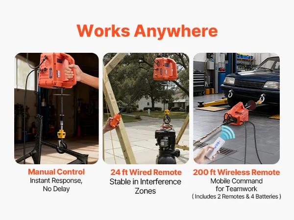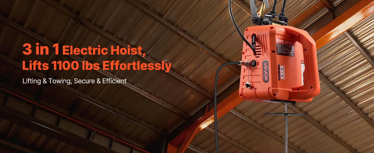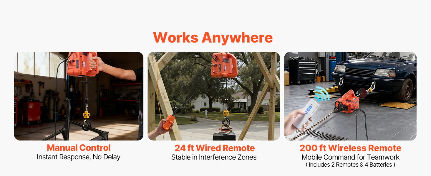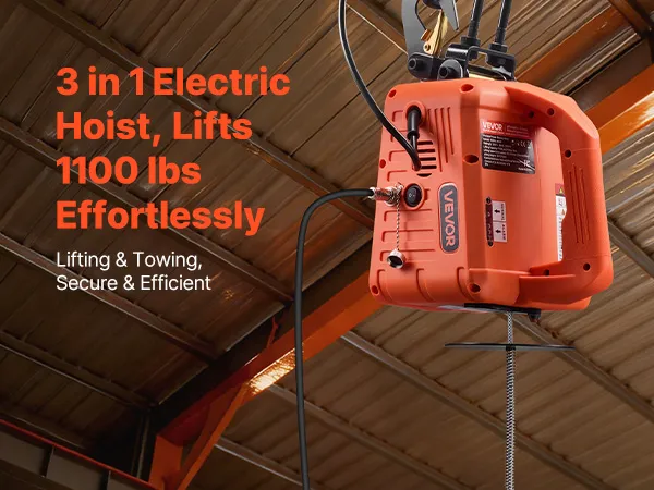 Controllo facile 3 in 1: questo paranco elettrico potente gestisce sollevamenti verticali e tiri orizzontali in un'unica unità. I pulsanti sulla maniglia rispondono rapidamente, il telecomando cablato da 8,3 m offre un controllo preciso